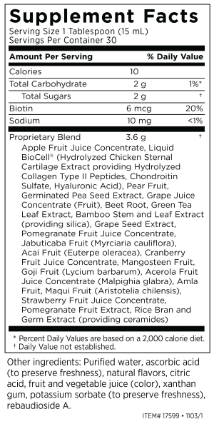PROPRIETARY BLEND: Apple Juice Concentrate*, Liquid BioCell® (proprietary chicken sternal cartilage extract providing hydrolyzed collagen type II peptides, chondroitin sulfate and hyaluronic acid) Pear Puree Concentrate*, Ascorbic Acid, Grape Juice Concentrate*, Beet Puree*, Green Tea Extract (Camellia sinensis) (Leaf)*, Grape Seed Extract*, Pomegranate Fruit Juice*, Jabuticaba Fruit Puree*, Açai Berry*, Cranberry Fruit Juice*, Mangosteen Fruit*, Goji Berry*, Acerola Fruit Juice*, Amla Fruit*, Maqui Berry*, Schisandra Berry*, Strawberry Fruit Juice*, Bamboo Extract (Stem & Leaf)*, Pomegranate Extract (Fruit)*, Wheat Lipid Extract (providing Ceramides and Glucosylceramides) (Lipowheat®), Rosemary Leaf Extract.
